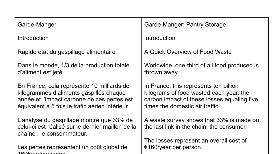 “Garde-Manger: Pantry Storage” – Educational Building Tutorial – This text is a step-by-step tutorial for building ecologically-focused kitchen pantry storage. I opted for a scientific tone, staying more loyal to the original French text to maintain technical accuracy, while injecting flowing English as needed to preserve usability. I decided to include and highlight some French cultural terms, considering the publishing context.